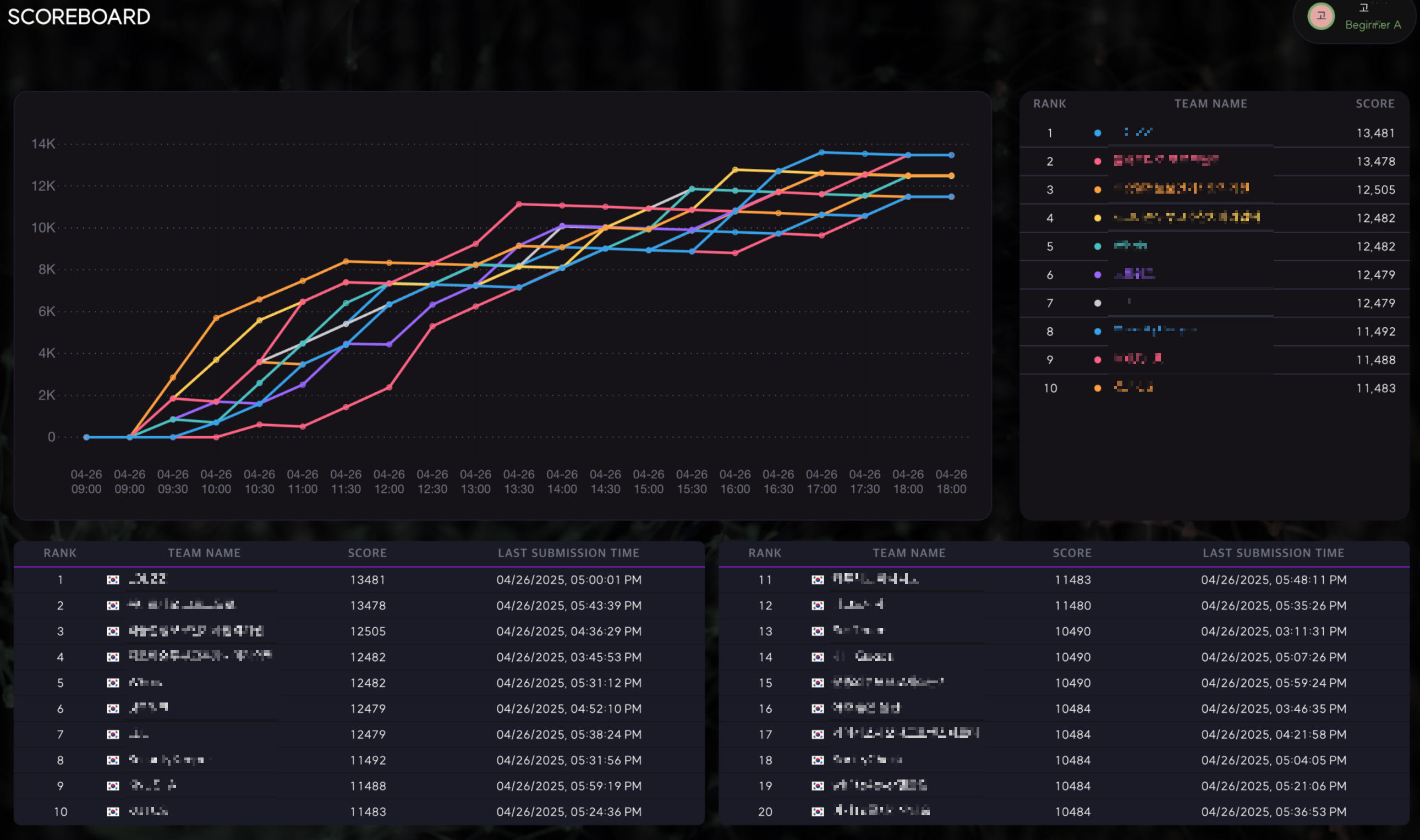 3문제 더 풀면 20등 안에 들고 20등 안에서도 동점 팀이 많아서 팀끼리 점수 차가 촘촘했다