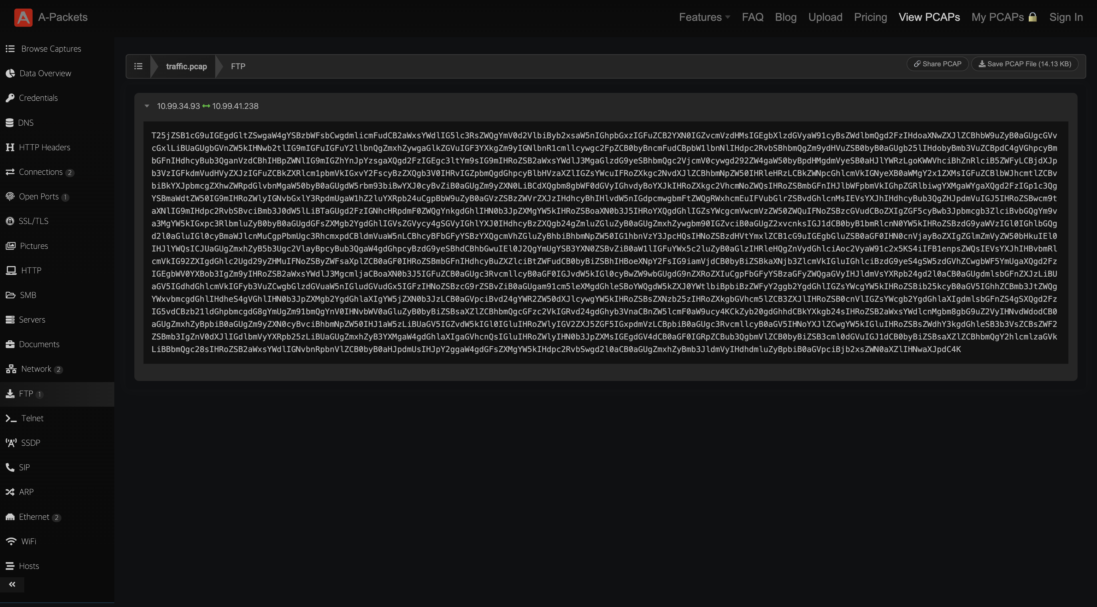 온라인 분석 사이트에 올려봤는데 FTP 통신 기록에 이런 인코딩 값이 저장되어 있었다 (https://apackets.com/pcaps/charts)