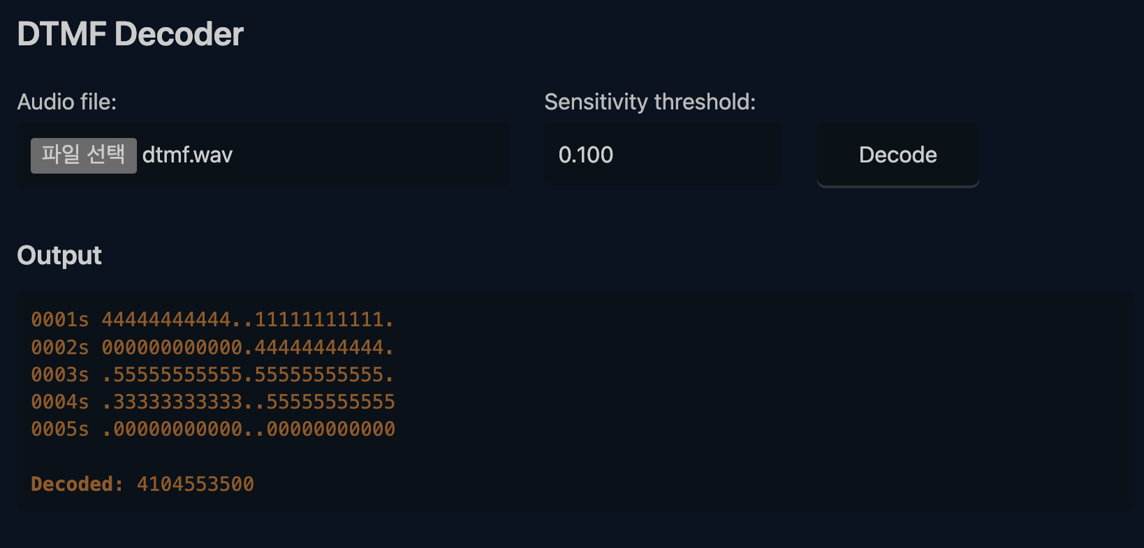 그냥 dtmf decoder 사이트 찾아서 돌렸다 (https://dtmf.netlify.app/)